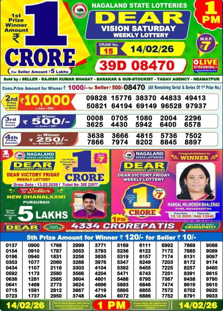 Nagaland State Lottery Sambad 14.2.2026 Today 1PM, 6PM & 8PM লটারি সংবাদ: There you are in this special post is about for the Nagaland state lottery 1pm morning, 6pm day and 8pm evening result one of the most prominent result for you and friends all the different posts can be updated with the most latest lottery sambad results so friends you can win here the first prize of 1 crore rupees so friends if you wants the fastest delivery of the results then do us been shortcut as the site name which is named as Nagaland state lottery so its the day of lovely weekend means Saturday 14th of February 2026 so its days sambad lottery which will be prouldy knwon to be as it will be Nagaland state lotteries DEAR OSTRICH EVENING and the result will be available at 1:10pm, 6:10pm and 8:10pm.