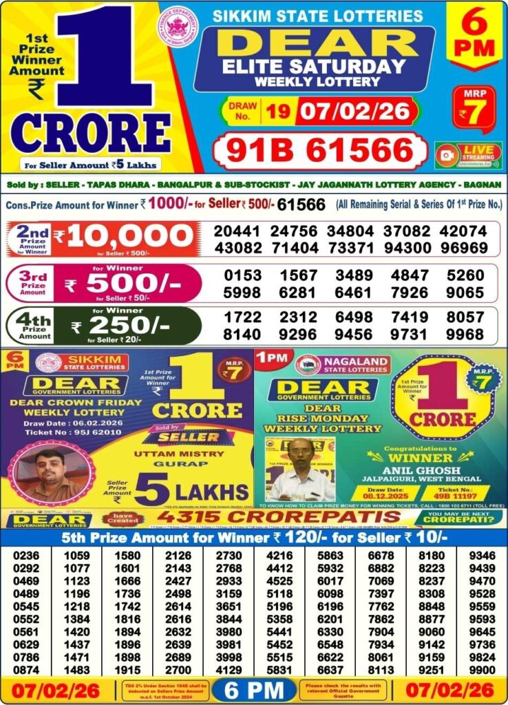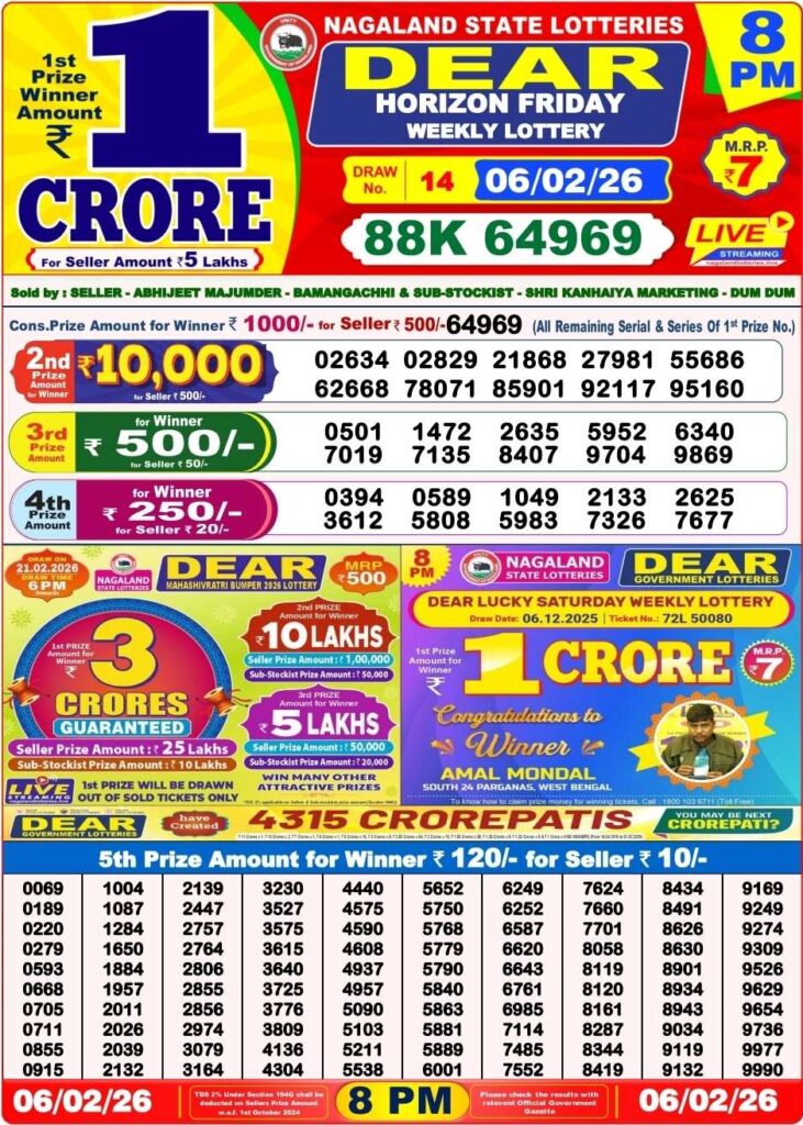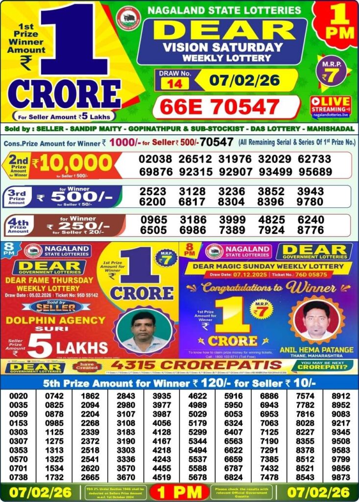 Nagaland State Lottery Sambad 7.2.2026 Today 1PM, 6PM & 8PM লটারি সংবাদ: Are you daily been searched for the most lovely Nagaland state lottery 1pm morning, 6pm day and 8pm evening result so friends try your luck with us with the first prize of 1 crore rupees so friends all the posts updated with the most latest lottery sambad results and friends if you wants the fastest delivery of the results then do us been shortcut as the site name which has been named to be as Nagaland state lottery so its the another great morning of lovely Friday 6th of February 2026 so its days peoples most favourite and lovely sambad lottery which will be tolf to be as it will be Nagaland state lotteries DEAR VULTURE EVENING and the result will be available at 1:10pm, 6:10pm and 8:10pm.