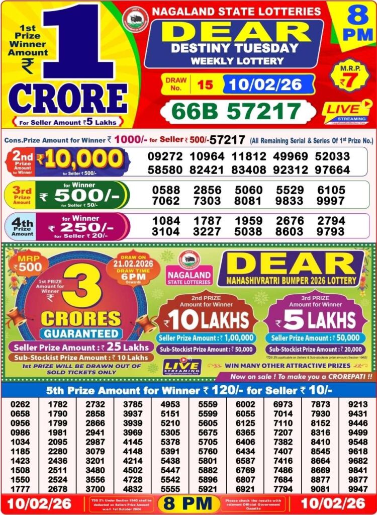 Nagaland State Lottery Sambad 10.2.2026 Today 1PM, 6PM & 8PM লটারি সংবাদ: Good morning my dear friends there you landed at the site Nagaland state lottery which is one of the most popular website where you daily gets the most latest and peoples most favourite lottery sambad results been posted in the best timing and friends there you can win the first prize of 1 crore rupees and this special post can be updated with the most popular Nagaland state lottery 1pm morning, 6pm day and 8pm evening result and its the another great morning of Monday a new week started means 9th of February 2026 so its days sambad lottery which will be alwyas been greatly known to be as it will be Nagaland state lotteries DEAR FLAMINGO EVENING and the result will be available at 1:10pm, 6:10pm and 8:10pm.