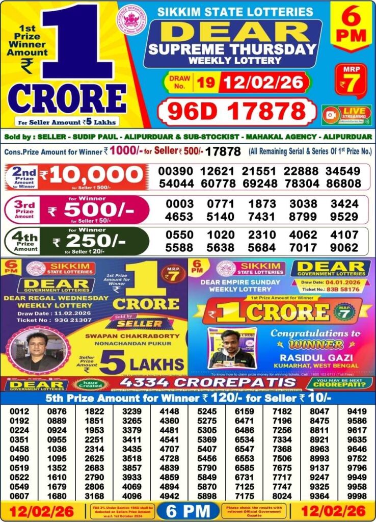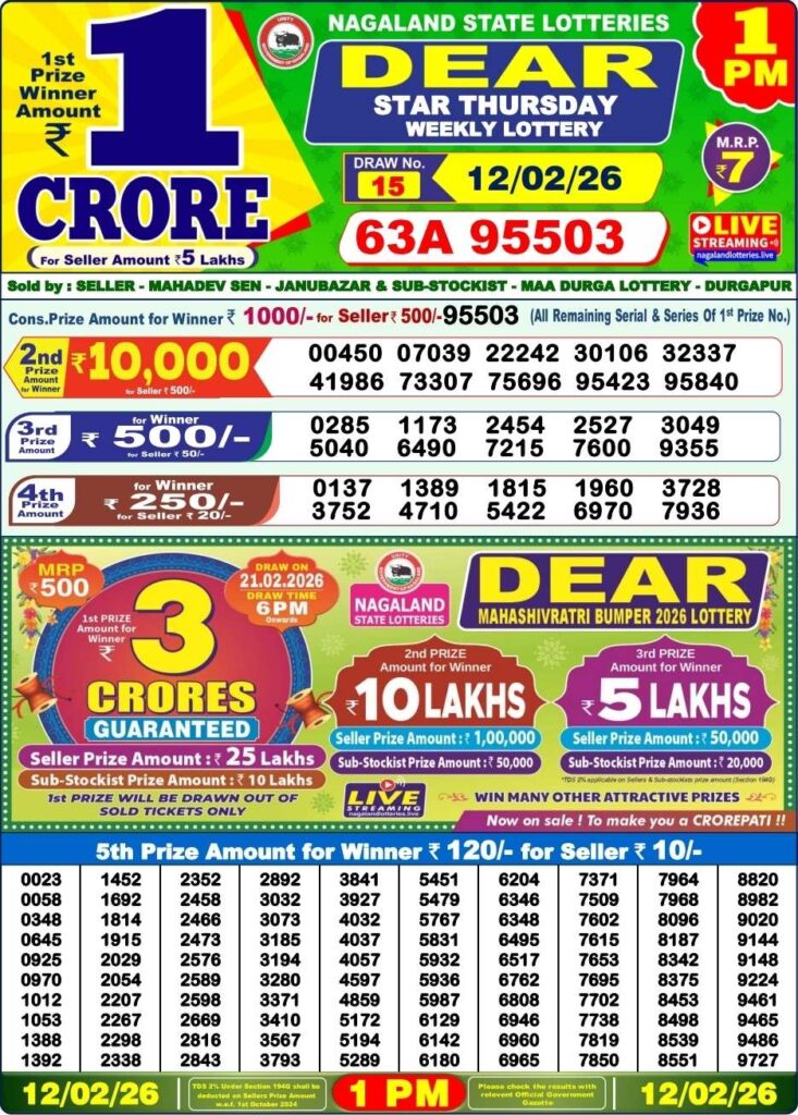 Nagaland State Lottery Sambad 12.2.2026 Today 1PM, 6PM & 8PM লটারি সংবাদ: Good morning my dear friends there you are in this website which will be alwyas been greatly named to be as Nagaland state lottery one of the most lovely website where you getting the most latest lottery sambad results and daily try your luck with us and getting the chance to win the first prize of 1 crore rupees and friends this special post can be updated with the most popular Nagaland state lottery 1pm morning, 6pm day and 8pm evening result and its the day of Wednesday 11th of February 2026 so its days sambad lottery which will be alwyas been proudly known to be as it will be Nagaland state lotteries DEAR EAGLE EVENING and the result will be available at 1:10pm, 6:10pm and 8:10pm.