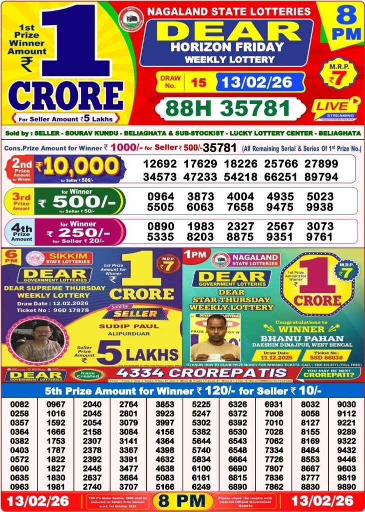Nagaland State Lottery Sambad 14.2.2026 Today 1PM, 6PM & 8PM লটারি সংবাদ: Good morning my dear friends there you are landed at the site which will be named to be as Nagaland state lottery which is one of the most fastest website where you daily getting the latetst lottery sambad results and friends you know that we are daily gives you the oppertunity to win the first prize of 1 crore rupees so riends you know that this special post been updated with the most latest Nagaland state lottery 1pm morning, 6pm day and 8pm evening result and its the another lovely day of Friday 13th of February 2026 its lucky days peoples most favourite sambad lottery which will be named to be as Nagaland state lotteries DEAR VULTURE EVENING and the result will be available at 1:10pm, 6:10pm and 8:10pm.