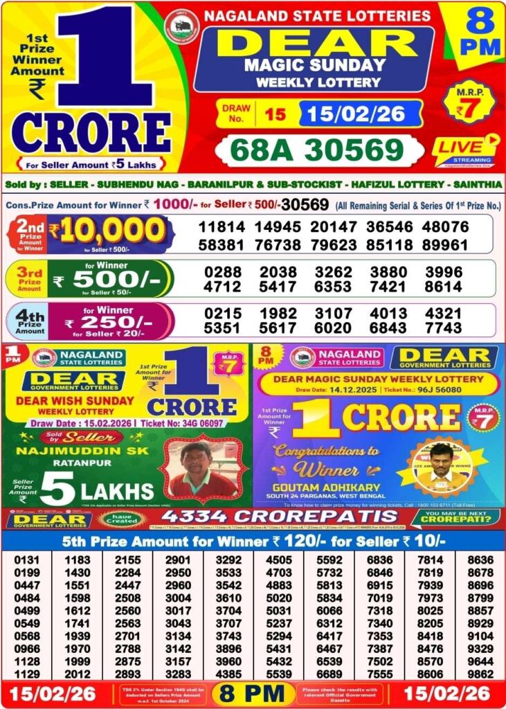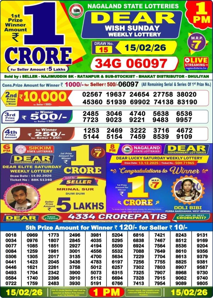 Nagaland State Lottery Sambad 16.2.2026 Today 1PM, 6PM & 8PM লটারি সংবাদ: There you are in this special post is about for the Nagaland state lottery 1pm morning, 6pm day and 8pm evening result one of the most prominent result for you and friends all the different posts can be updated with the most latest lottery sambad results so friends you can win here the first prize of 1 crore rupees so friends if you wants the fastest delivery of the results then do us been shortcut as the site name which is named as Nagaland state lottery so its the day of lovely weekend means Saturday 14th of February 2026 so its days sambad lottery which will be prouldy knwon to be as it will be Nagaland state lotteries DEAR OSTRICH EVENING and the result will be available at 1:10pm, 6:10pm and 8:10pm.