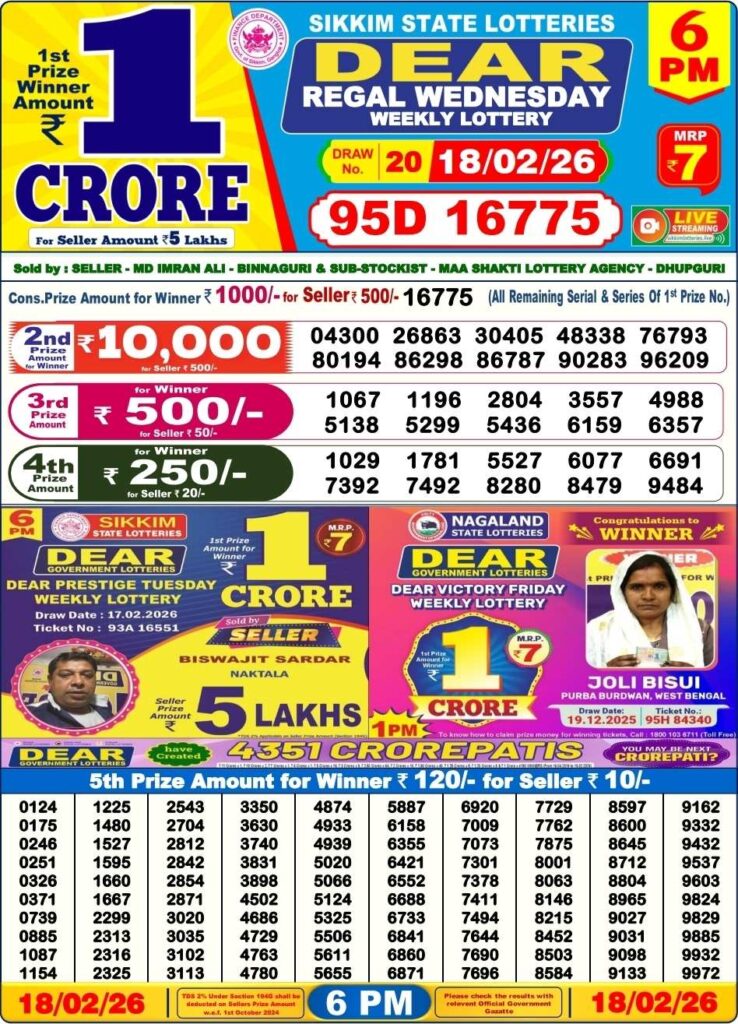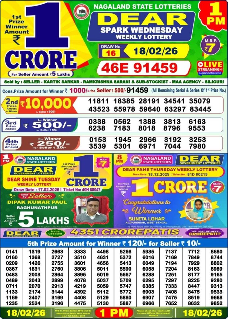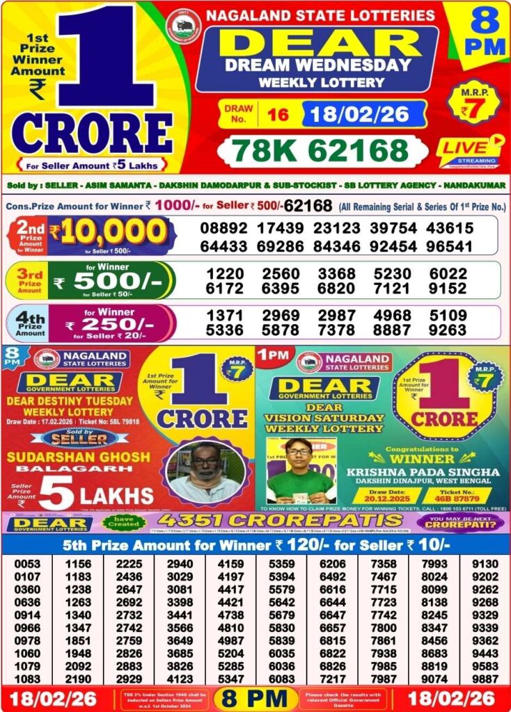 Nagaland State Lottery Sambad 19.2.2026 Today 1PM, 6PM & 8PM লটারি সংবাদ: Good day my dear friends there you are in this lovely website which has been named to be as Nagaland state lottery one of the most fastest website where you daily found for the latest lottery sambad results and friends you know that there are always fastest in this industry and friends there you know that this special post can be updated with the most latest Nagaland state lottery 1pm morning, 6pm day and 8pm evening reuslt and its the day of Wednesday 18th of February 2026 its days sambad lottery which will be alwyas been greatly known to be as it will be Nagaland state lotteries DEAR EAGLE EVENING and the result will be available at 1:10pm, 6:10pm and 8:10pm.
