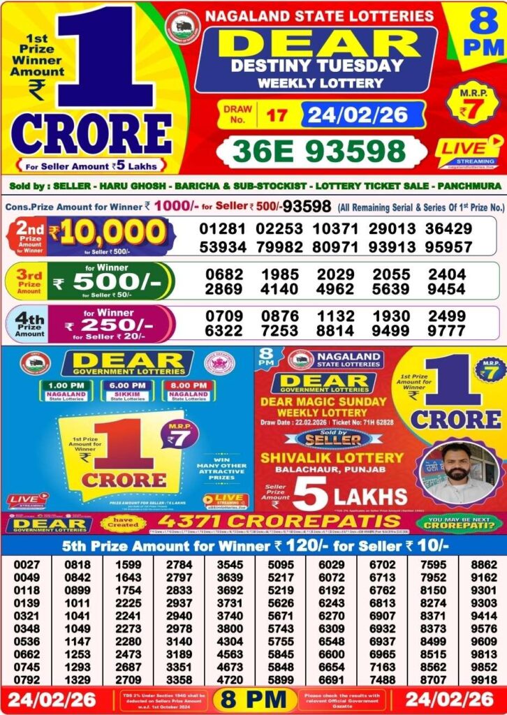 Nagaland State Lottery Sambad 25.2.2026 Today 1PM, 6PM & 8PM লটারি সংবাদ: Are you daily been searched for the most lovely and peoples favourite Nagaland state lottery 1pm morning, 6pm day and 8pm evening result and dear friends there you know that this special post and all the different posts can be updated with the mos latest lottery sambad results and dear friends you can win the first prize of 1 crore rupees for the fastest delivery of the results then do us been shortcut as the site name which has been named as Nagaland state lottery so its the day of Tuesday 24th of February 2026 so its day sambad lottery which will be named to be as nost searched as Nagaland state lotteries DEAR PARROT EVENING and the result will be available at 1:10pm, 6:10pm and 8:10pm.
