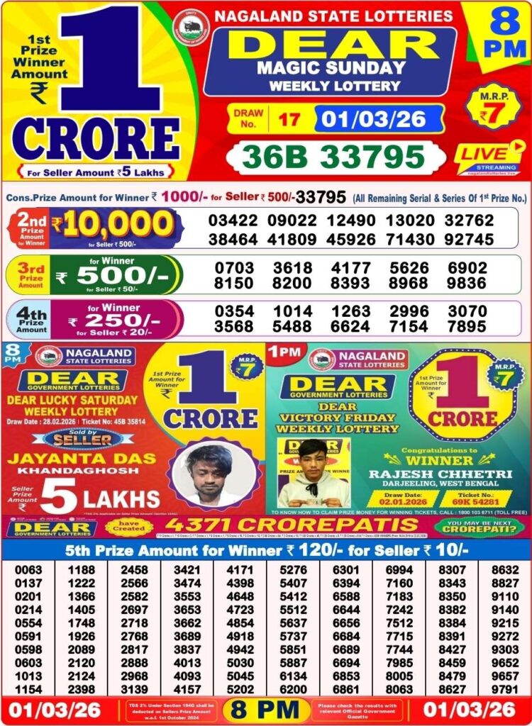 Nagaland State Lottery Sambad 2.3.2026 Today 1PM, 6PM & 8PM লটারি সংবাদ: Good morning my dear friends there you landed at Nagaland state lottery which is one of the most fastest website where you daily been getting the chance to win the first prize of 1 crore rupees with other cash prizes with the latest lottery sambad results and dear viewers there you alwyas know that this special post is about Nagaland state lottery 1pm morning, 6pm day and 8pm evening result and viewers you know that its the another great morning of Sunday a lovely holiday 1st of March new month started so its days sambad lottery which will be alwyas been greatly known to be as Nagaland state lotteries DEAR HAWK EVENING and the result will be available at 1:10pm, 6:10pm and 8:10pm.