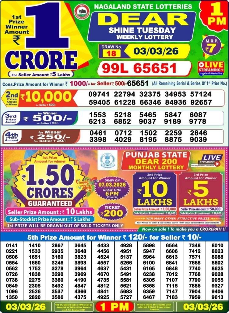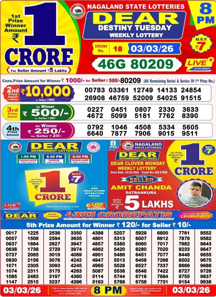 Nagaland State Lottery Sambad 4.3.2026 Today 1PM, 6PM & 8PM লটারি সংবাদ: Good morning my dear friends there you are at Nagaland state lottery one of the most powerful website where you daily been getting updated with the most latest and peoples most favourite lottery sambad results and friends you daily getting the chance to win the first prize of 1 crore rupees and friends this special post is about for the most latest Nagaland state lottery 1pm morning, 6pm day and 8pm evening result and its the another great morning of Tuesday Happy Dol Purnia to you all 3rd of March 2026 so its days sambad lottery which will be alwyas been known to be as Nagaland state lotteries DEAR PARROT EVENING and the result will be available at 1:10pm, 6:10pm and 8:10pm.