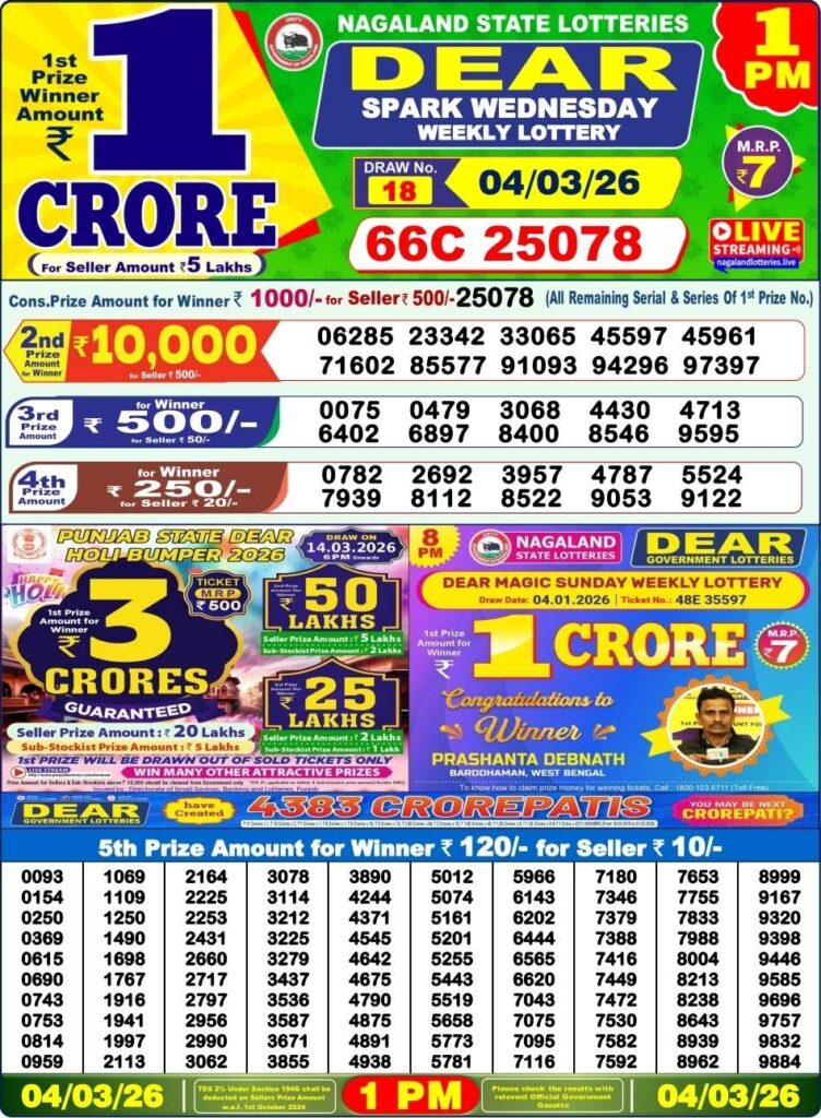 Nagaland State Lottery Sambad 5.3.2026 Today 1PM, 6PM & 8PM লটারি সংবাদ: Are you finding for the most popular Nagaland state lottery 1pm morning, 6pm day and 8pm evening result and then you are on the right place and there you can win daily first prize of 1 crore rupees so friends all the posts been updated with the most latest lottery sambad results and daily try your luck with us and if you needs the faster results then do us bookmarked as the site name which has called to be as Nagaland state lottery and its the another day of Wednesday 4th of March 2026 Happy Holi to you all its days most popular and aweosme sambad lottery known to be as it will be Nagaland state lotteries DEAR EAGLE EVENING and the result will be available at 1:10pm, 6:10pm and 8:10pm.