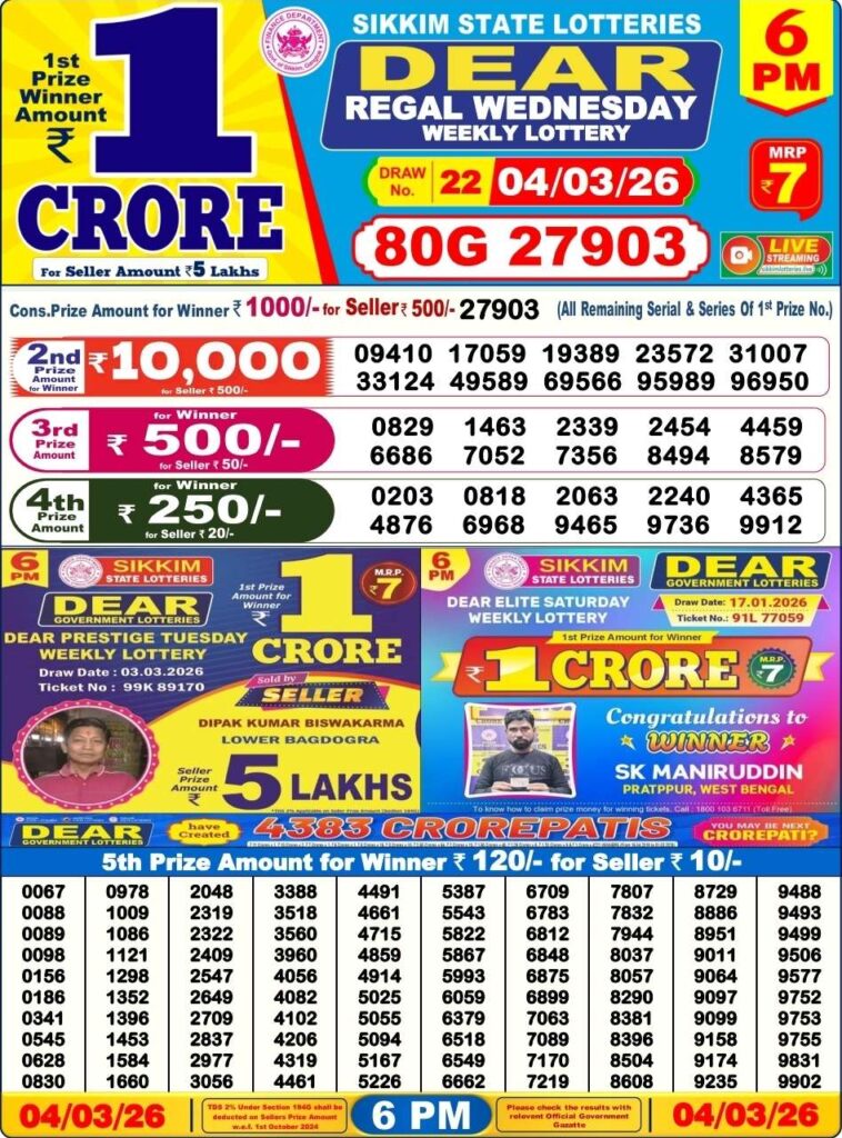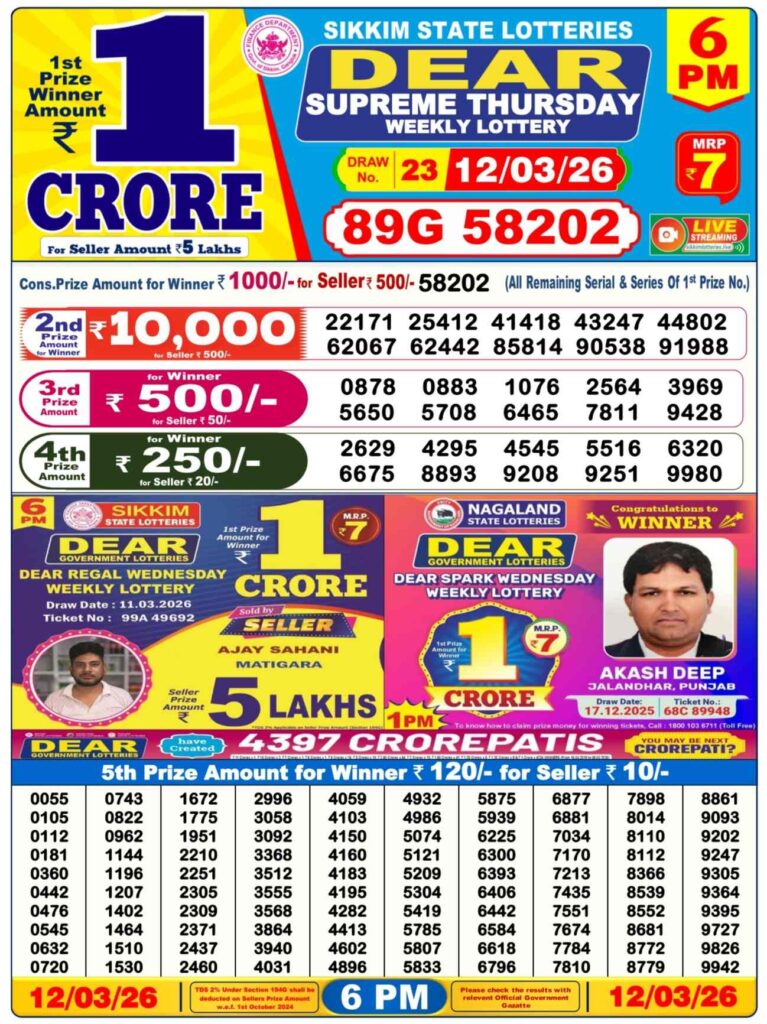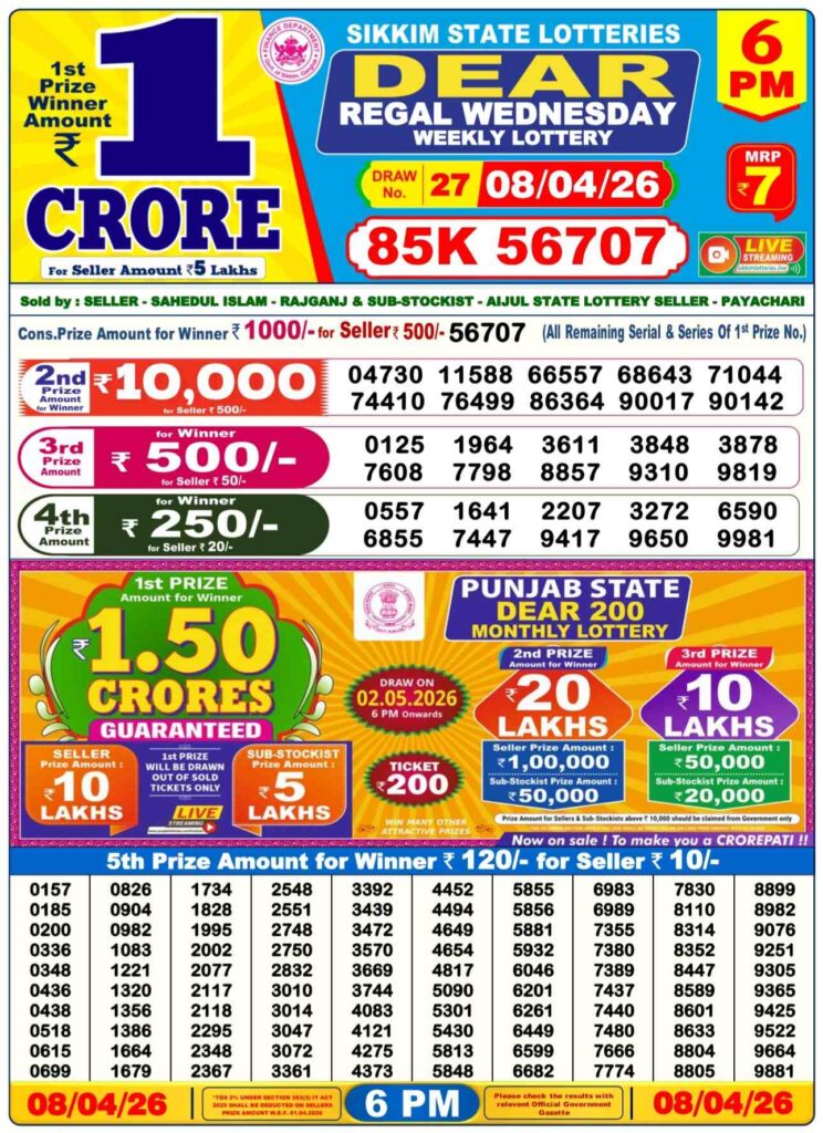 Sikkim State Lottery Result is released each day at 1 pm. Sikkim State Lottery Results 1 PM is also referred to in the form of Dhankesari Lottery Sambad. You can watch the Lottery Sambad draw live on Youtube.com.