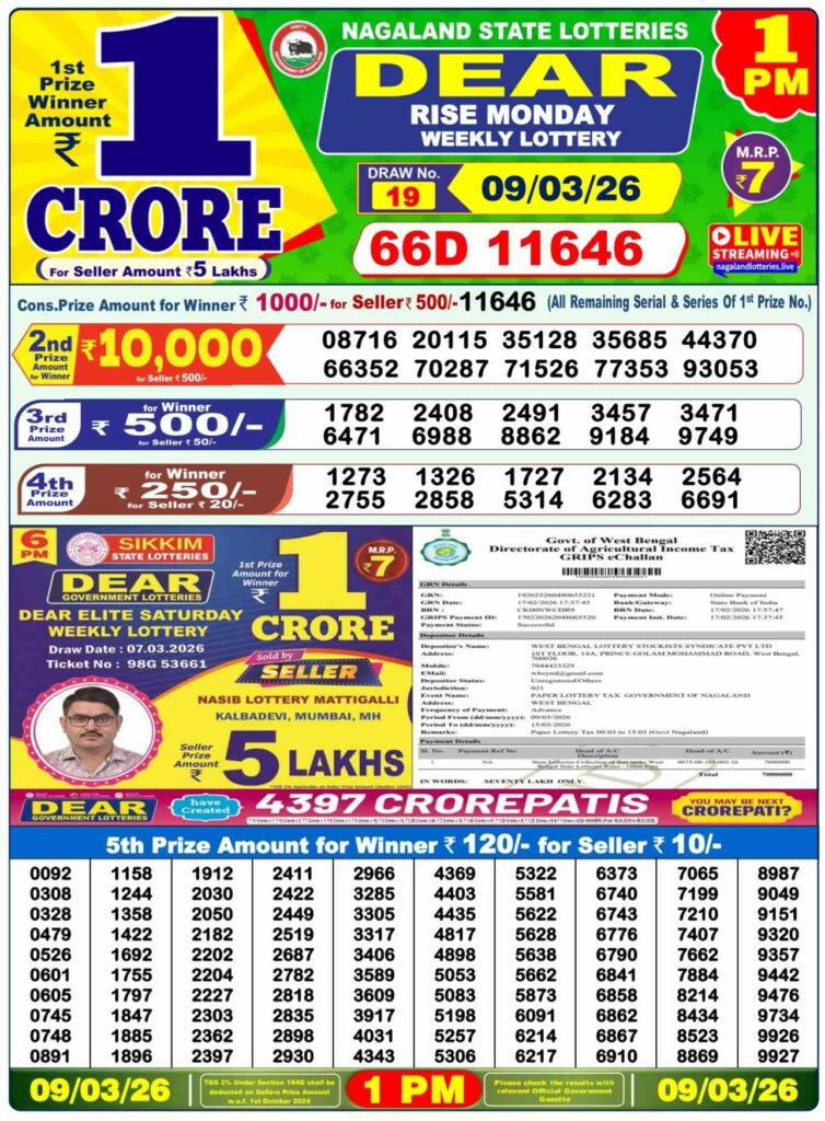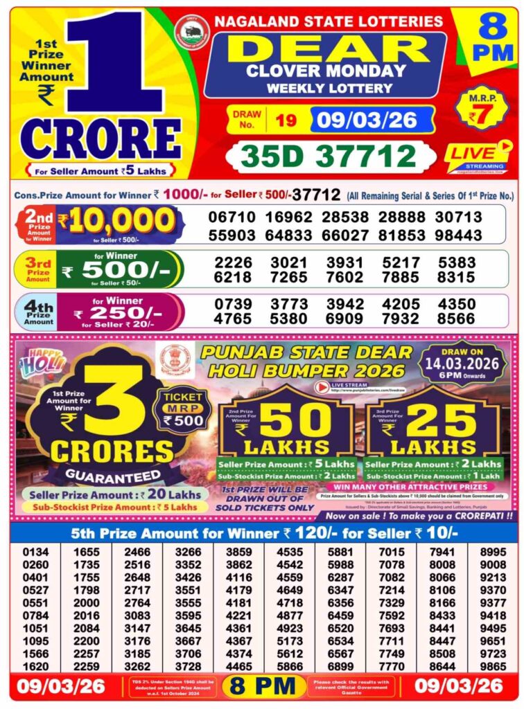 Nagaland State Lottery Sambad 10.3.2026 Today 1PM, 6PM & 8PM লটারি সংবাদ: Good morning my dear friends there you are landed at the website which has been named as Nagaland state lottery one of the most fastest website where you gets updated with lottery sambad results and friends it can be your life chnager oppertunity where you can gets win the first prize of 1 crore rupees and friends this special post can be be daily been updated with the Nagaland state lottery 1pm morning, 6pm day and 8pm evening result and its the another great day of Monday new week started means 9th of March 2026 so its days sambad lottery which will be alwyas been named as Nagaland state lotteries DEAR FLAMINGO EVENING and the result will be available at 1:10pm, 6:10pm and 8:10pm.