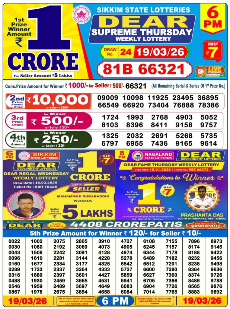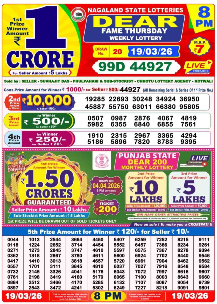 Nagaland State Lottery Sambad 19.3.2026 Today 1PM, 6PM & 8PM লটারি সংবাদ: Are you daily been here visited for the most awesome Nagaland state lottery 1pm morning, 6pm day and 8pm evening result and my dear friends there you daily getting the most latest lottery sambad results and it can be many of the peopels game changer with the time and there you can win the first prize of 1 crore rupees and other different prizes and my dear viewers there if you wants the fastest delivery of the results then do us been created shortcut as the site name which has been named as Nagaland state lottery so its the another great morning of Thursday a lovely guruvar its days sambad lottery which will be alwyas been greatly known to be as it will be Nagaland state lotteries DEAR FALCON EVENING and the result will be available at 1:10pm, 6:10pm and 8:10pm.