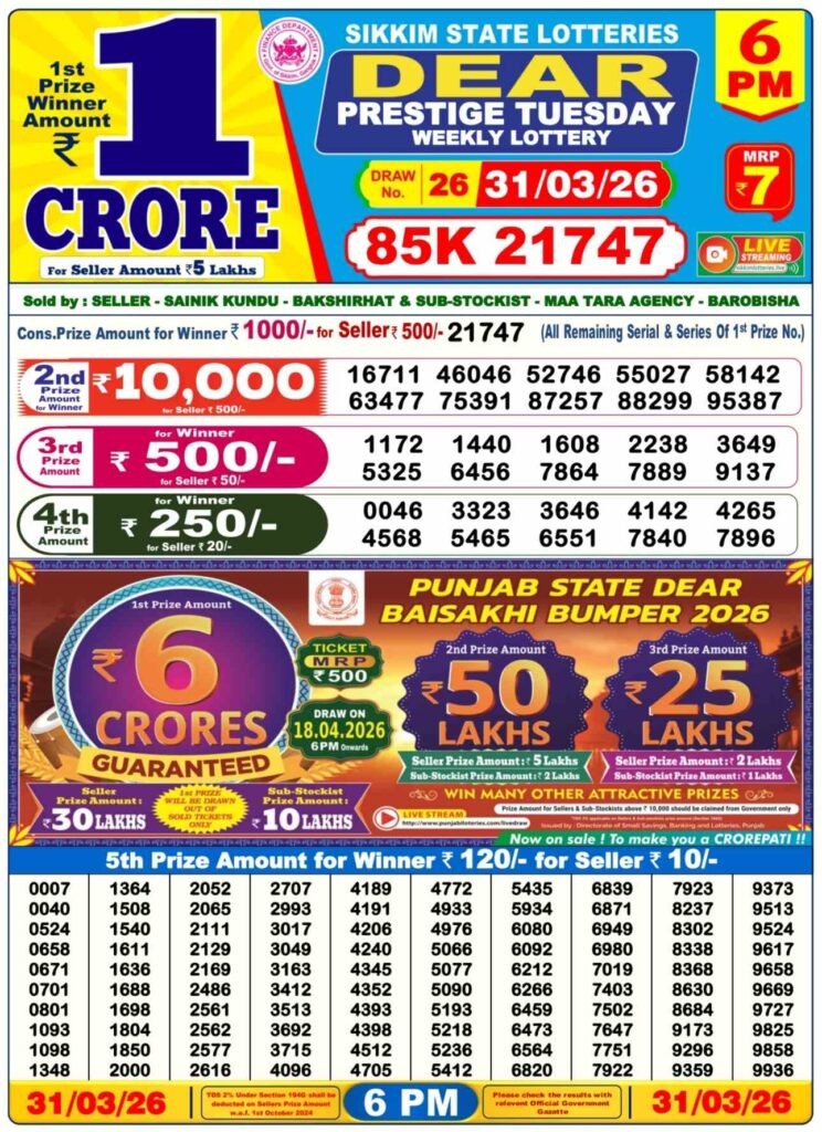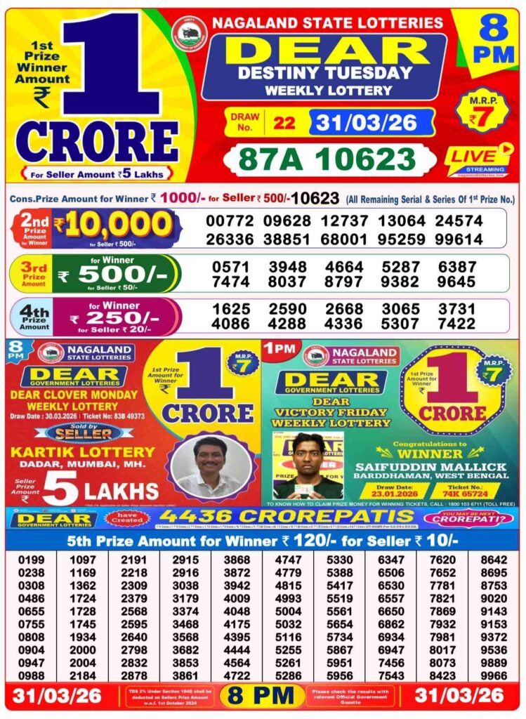 Nagaland State Lottery Sambad 1.4.2026 Today 1PM, 6PM & 8PM লটারি সংবাদ: Are you daily been alwyas searched for the most awesome Nagaland state lottery 1pm morning, 6pm day and 8pm evening result and my dear friends there all the posts gives you the oppertunity to win the first prize of 1 crore rupees and all the detaild posts can be updated with the lottery sambad results and dear friends there if you daily been wanted the fastest delivery of the results then do us been created bookmarked as the site name which has been named to be as Nagaland state lottery so its the new week started means Monday 30th of March 2026b so its days sambad lottery which will be alwyas been greatly known to be as it will be Nagaland state lotteries DEAR FLAMINGO EVENING and the result will be available at 1:10pm, 6:10pm and 8:10pm.