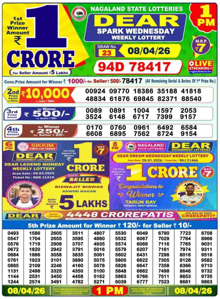 Nagaland State Lottery Sambad 8.4.2026 Today 1PM, 6PM & 8PM লটারি সংবাদ: There you are in this special post is about for the Nagaland state lottery 1pm morning, 6pm day and 8pm evening result and this will be your life changer oppertunity where you where you can gets the first prize of 1 crore rupees and other cash prizes and all the posts updated with the most latest lottery sambad results dear friends if you wants the fastest delivery of the results then do us shortcut as site name which is ha been named to be as Nagaland state lottery so its the another new week started Monday 6th of March 2026 so its days sambad lottery which will be alwyas known to be as Nagaland state lotteries DEAR FLAMINGO EVENING and the result will be available at 1:10pm, 6:10pm and 8:10pm.