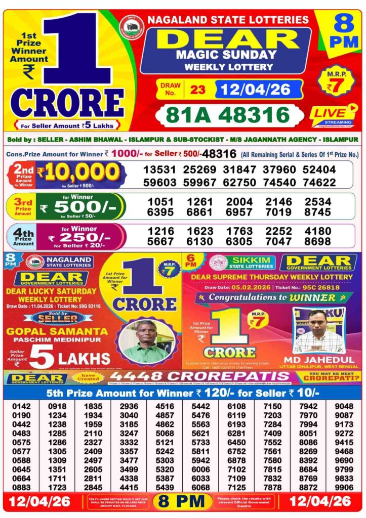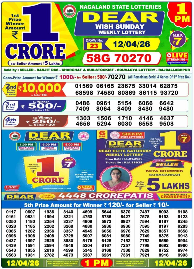 Nagaland State Lottery Sambad 12.4.2026 Today 1PM, 6PM & 8PM লটারি সংবাদ: There you are in this special post is about for the Nagaland state lottery 1pm morning, 6pm day and 8pm evening result then you are here in the right place where all the diffenrt posts is about daily updated with the most latest lottery sambad results and dear friends there you gets the chance to win many cash prizes like first prize of 1 crore rupees and if you needs the fastest delievry of the results then do us shortcut as site name which is Nagaland state lottery so its the day of lovely holiday Sunday 12th of April 2026 so its days sambad lottery which will be alwyas been greatly known to be as it will be Nagaland state lotteries DEAR HAWK EVENING and the result will be available at 1:10pm, 6:10pm and 8:10pm.