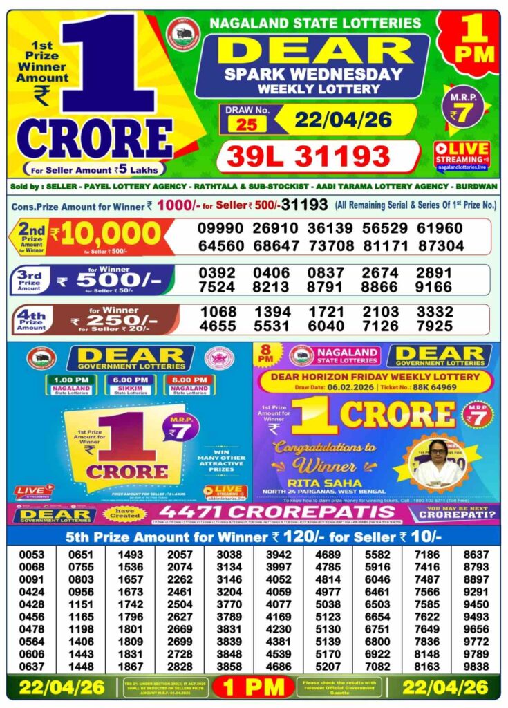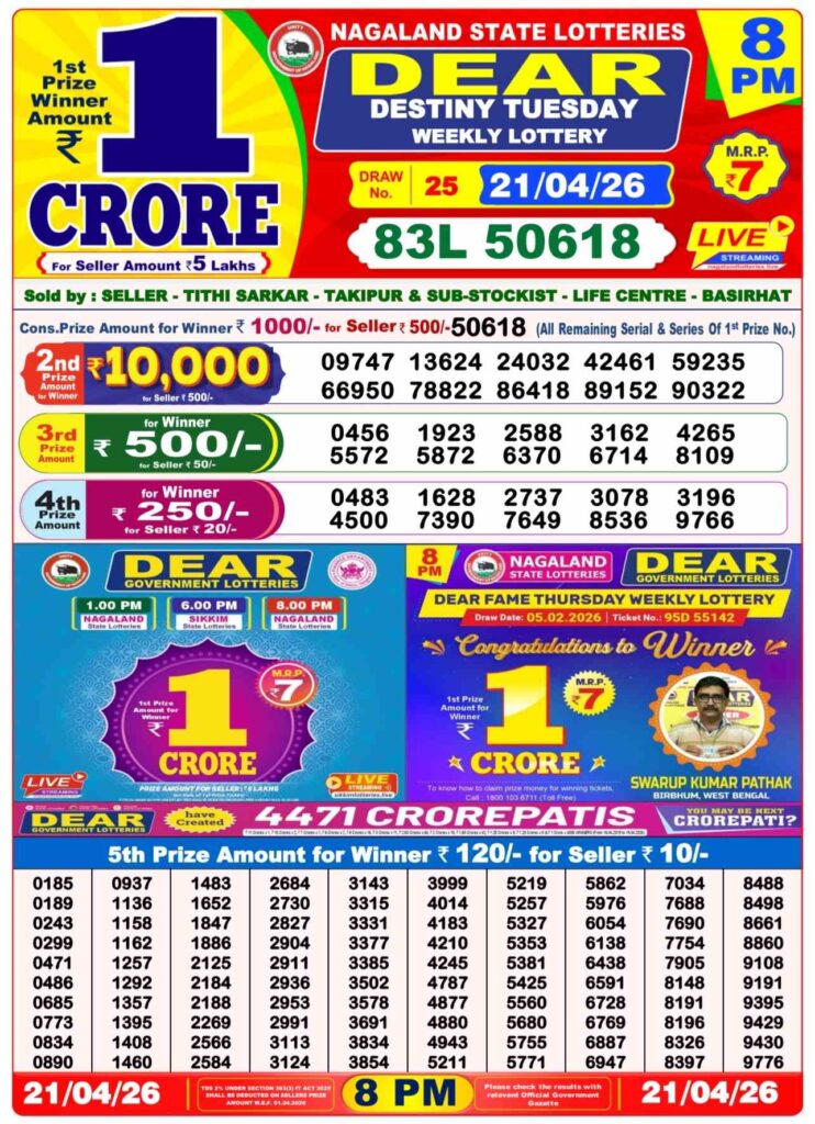 Nagaland State Lottery Sambad 21.4.2026 Today 1PM, 6PM & 8PM লটারি সংবাদ: Good morning my dear viewers there you daily landed at the website which is named as Nagaland state lottery one of the most fastest website where you getting the latest lottery sambad results and it will be you daily gives you the chances to win many cash prizes and other cash prizes like 1 crore rupees of first prize and this special post can be updated with the Nagaland state lottery 1pm morning, 6pm day and 8pm evening result and its the another great day of Tuesday 21st of April 2026 so its days peoples most favourite and awesome sambad lottery which will be told to be as it will be Nagaland state lotteries DEAR PARROT EVENING and the result will be available at 1:10pm, 6:10pm and 8:10pm.
