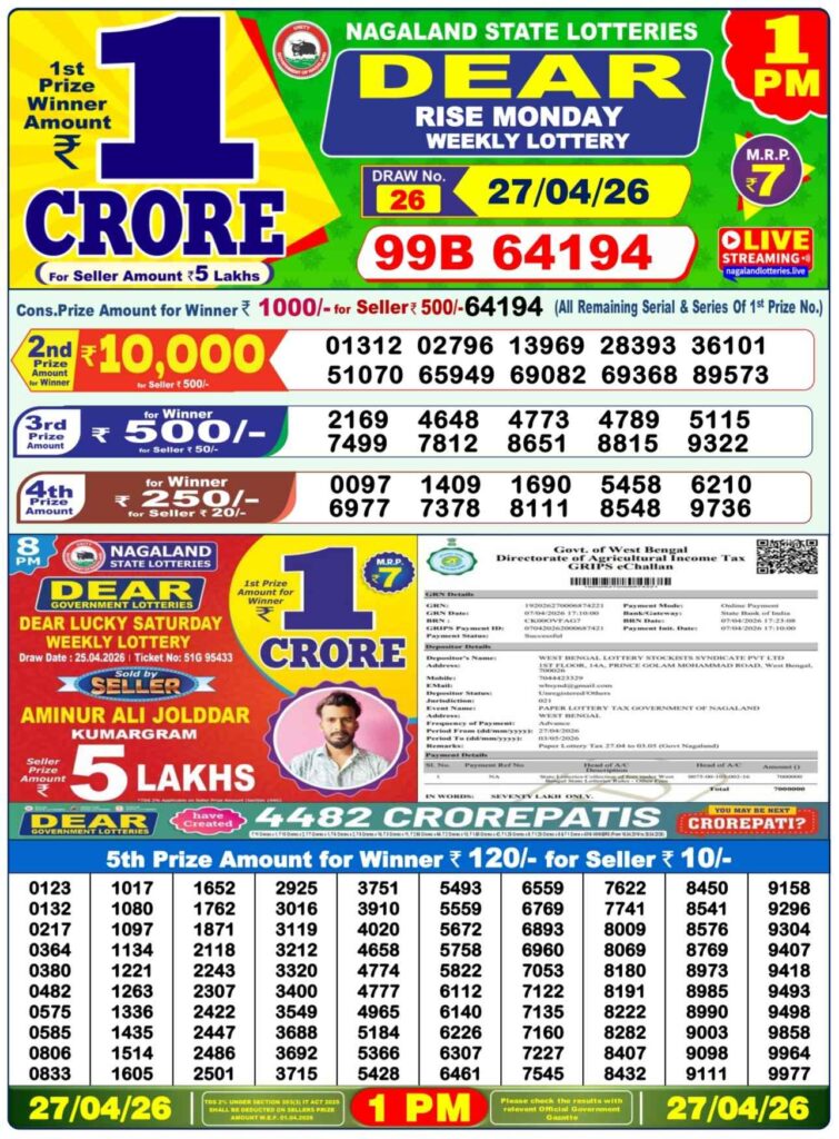 Nagaland State Lottery Sambad 26.4.2026 Today 1PM, 6PM & 8PM লটারি সংবাদ: There you are visited for the most lovely Nagaland state lottery 1pm morning, 6pm day and 8pm evening result and friends there you can win many cash prizes and other cash prizes lke first prize of 1 crore rupees and all the posts updated with the latest lottery sambad results and if you wants the fastest delivery of the results then you can do us been shortcut as the site name which has been named to be as alwyas Nagaland state lottery so its the day of Sunday a free holiday 26th of April 2026 so its days sambad lottery which will be alwyas been greatly known to be as it will be Nagaland state lotteries DEAR HAWK EVENING and the result will be available at 1:10pm, 6:10pm and 8:10pm.