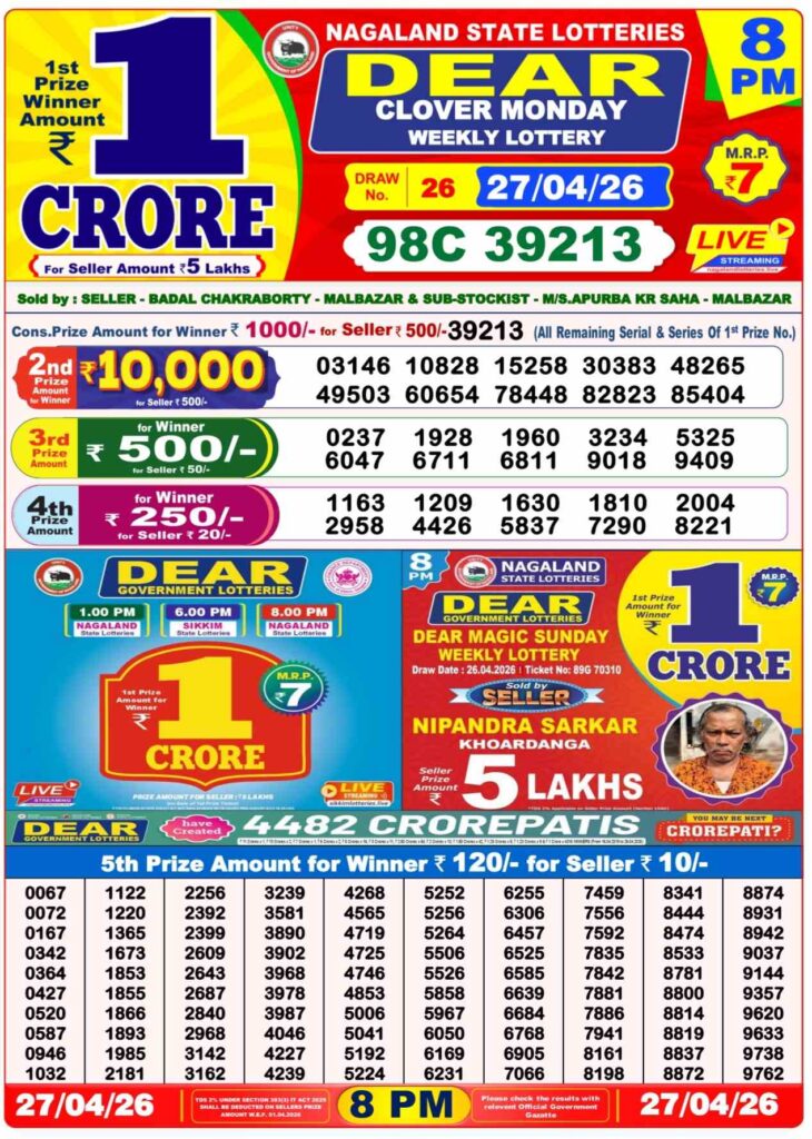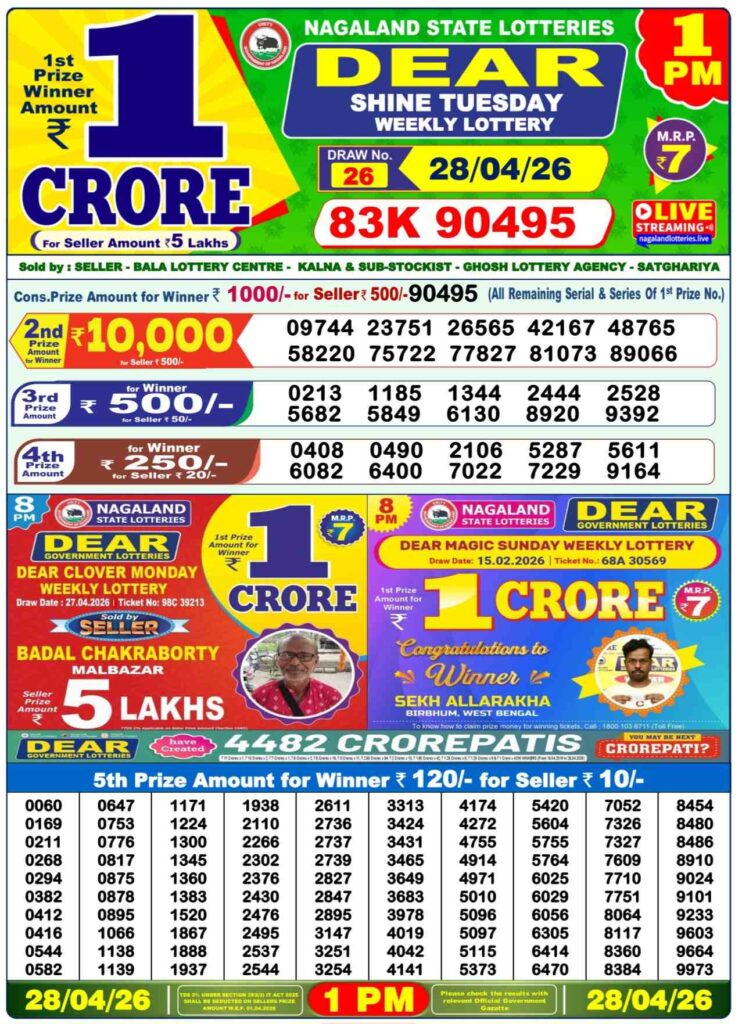 Nagaland State Lottery Sambad 27.4.2026 Today 1PM, 6PM & 8PM লটারি সংবাদ: Good morning my dear friends there you are landed at the site which has been named as Dhankesrai lottery one of the most fastest webiste in the industry of the most popular lottery sambad results and it will be your life changer oppertunity with the time and there you can win first prize of 1 crore rupees and other cash prizes and this special post can be updated with the most popular Nagaland state lottery 1pm morning, 6pm day and 8pm evening result and its the another great orning of Monday new week started Monday 27th of April 2026 so its days most lovely sambad lottery which will be alwyas been greatly known to be as Nagaland state lotteries DEAR FLAMINGO EVENING and the result will be available at 1:10pm, 6:10pm and 8:10pm.