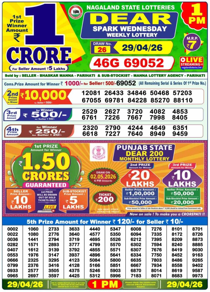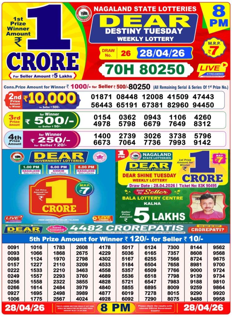 Nagaland State Lottery Sambad 28.4.2026 Today 1PM, 6PM & 8PM লটারি সংবাদ: There you are in this post is about for the Nagaland state lottery 1pm morning, 6pm day and 8pm evening result and friends there you know that this special post and all the other detailed differnt posts can be updated with the latest lottery sambad results and there you can win many cash prizes and loike first prize of 1 crore rupees and if you needs the fastest delivery of the results then do us been created bookmarked as site name which is Nagaland state lottery so its the day of Tuesday 28th of April 2026 so its days sambad lottery can it be proudly named to be as it will be alwyas Nagaland state lotteries DEAR PARROT EVENING and the result will be available at 1:10pm, 6:10pm and 8:10pm.