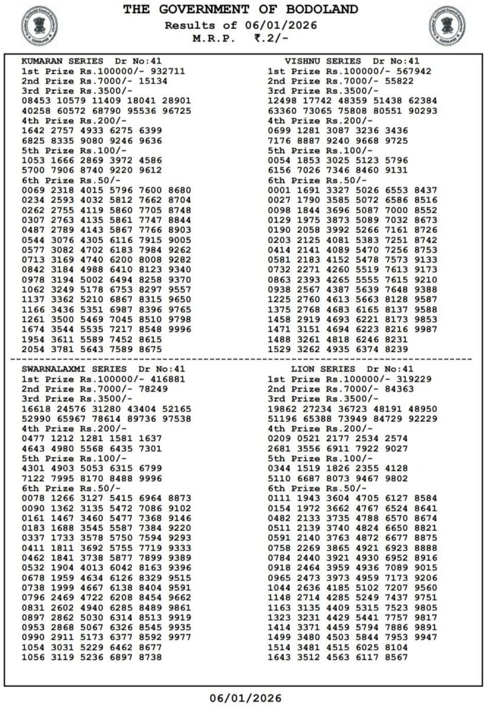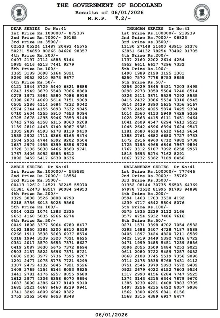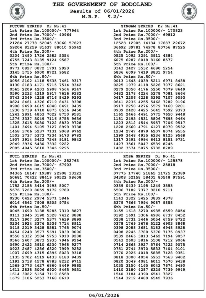 Bodoland Lottery Today Result 3PM 7.1.2026 Assam State Lotteries: Good day my dear viewers there you are in this specail website which has been named as Nagaland state lottery which is one of the India’s top leading website where all then posts been daily updated with most latest and peoples favourite sambad lottery and you can be win the many cash prizes like first prize of 1 core rupees and friends this post been daily posted the most latest Bodoland Lottery 3pm day result so its the day of Tuesday 7th January 2026 so its days sambad lottery which will be always known to be as Bodoland Lotteries and the result will be available at 3:10pm here you can get the chance to win the 1CR rupees an friends we also provided you the most awesome Sikkim state lottery, West Bengal state lottery, Nagaland State Lottery and this site known as Lottery Sambad.