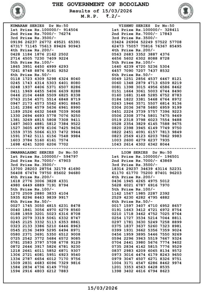 Bodoland Lottery Today Result 3PM 16.3.2026 Assam State Lotteries: Are you daily been searched for the most latest Bodoland lottery 3pm day result and friends there many of the peopels try their luck with us and this post and all the other differnt posts can be daily been updated with the most latest lottery sambad results and win the first prize of 1 crore rupees and if you wants the fastest deliveyr of the results then do us been shortcut as the site name which has been named as Nagaland state lottery so its the day of Sunday a free holiday 15th of March 2026 so its days sambad lottery which will be alwyas been greatly known to be as it will be Bodoloand lotteries and the result will be available at 3:10pm here you can get the chance to win the 1CR rupees an friends we also provided you the most awesome Sikkim state lottery, West Bengal state lottery, Nagaland State Lottery and this site known as Lottery Sambad.